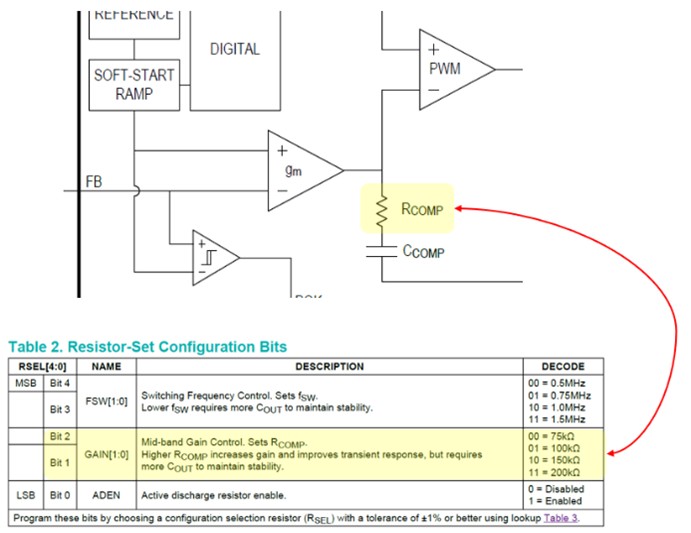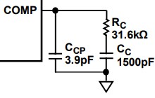 端子名としては、COMPやVc, Ithと表現している製品もありますが、基本的に全て同じモノと考えて良いです。このR,C部品をIC内部に予め内蔵している製品もあります。μModule製品やモノリシック製品に多い傾向にあり、それらは基本的にはこれを設計する必要はありません。従いまして可能であればそれらを第一候補に選定されることを推奨いたします。またLTpowerCADツール等で設計ガイドを得られる、またはデータシートに設計データや式が得られるものはそれらに従います。しかしながらそのどちらも得られない場合は、本ノートが基本設計のガイドとなり得ることを期待します。また内部位相補償の製品でもユーザーが定数を選べる様な製品も有りますので、そういった場合も補償の知識は有益と言えます。(例:MAX77504 下図参照)
