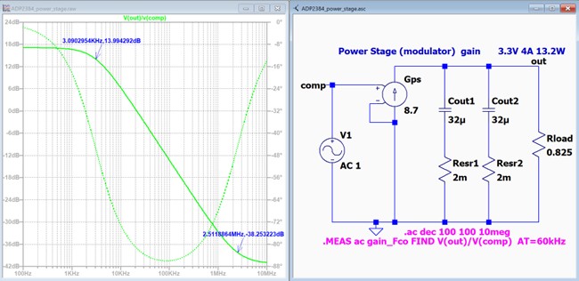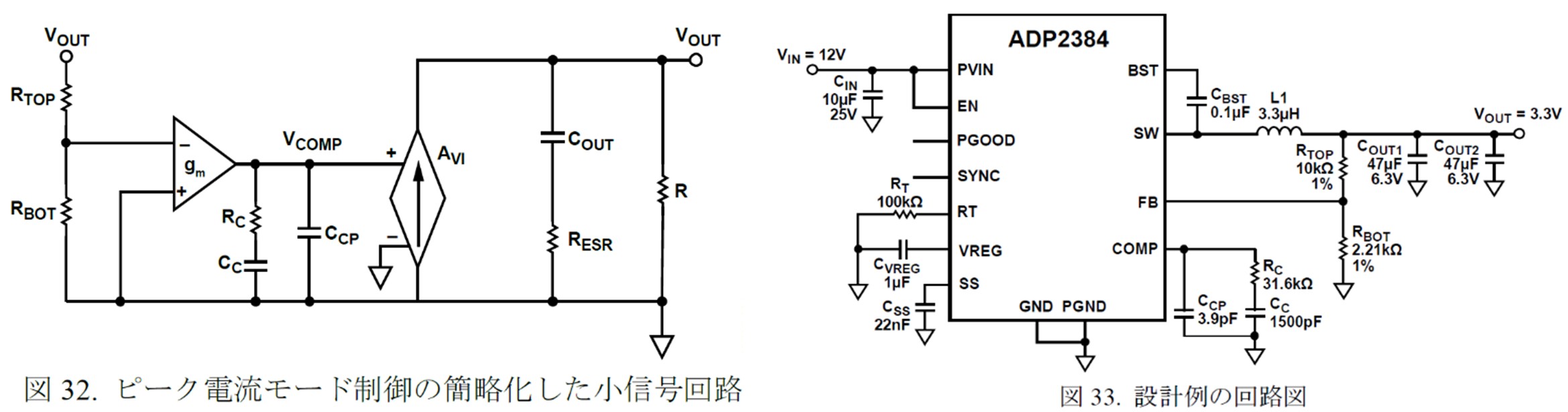 今回の題材としてADP2384のデータシート情報を取り上げます。データシート17ページには簡略化した小信号回路 図32があり、これを図33の3.3V出力の回路図例で検討します。