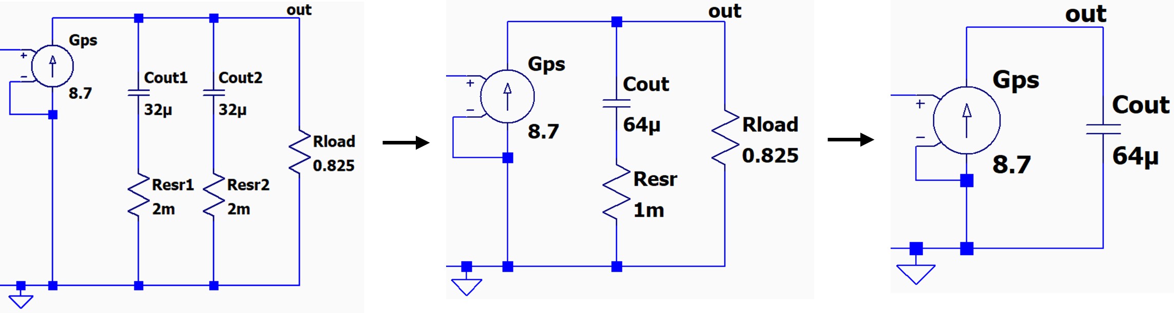 交流回路のインピーダンス計算の復習をしながら、CoutとRloadの並列回路で作られる合成インピーダンスを計算してみましょう。 このパワーステージ2個の並列のCoutを1個と考えてもう少し整理・簡単に表すと真ん中の図になります。