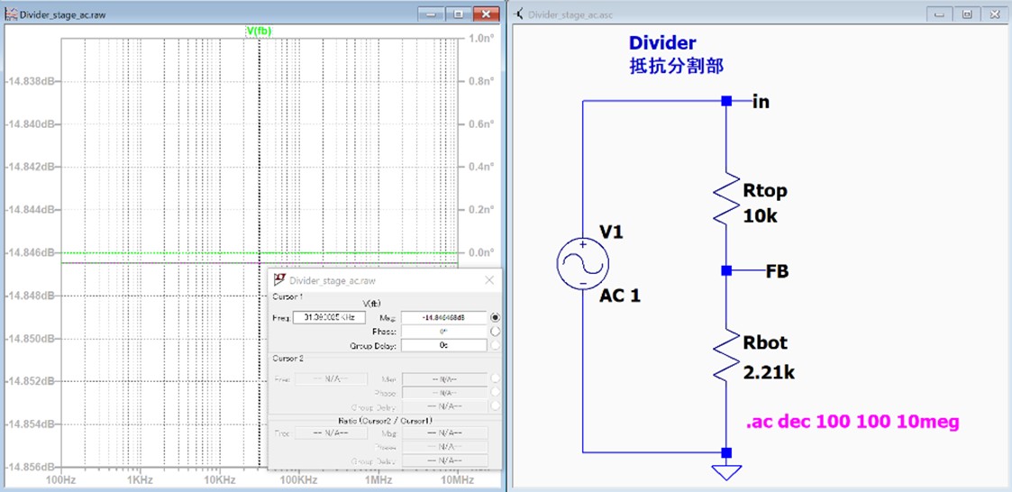 出力電圧設定用の抵抗分割部の検討を行います。今回は並列にコンデンサは付けておりませんので、ゲイン・位相共に周波数特性は有りません。