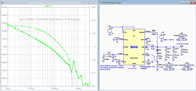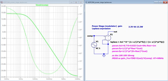 ADP2384のデータシート17ページに、この電力段のラプラス表記での伝達関数式Gvd(s)を掲載していますのでこれもLTspiceのE電源を使って参考までに再現を試みてみました。結果は次の図です。