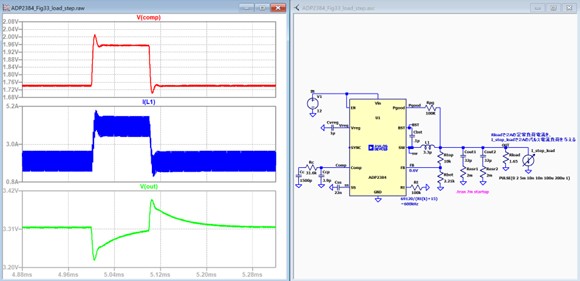 ここまではAC解析で見てきましたがスイッチングレギュレータの実際の動作条件である時間解析のFRAシミュレーションを行ってみましょう。