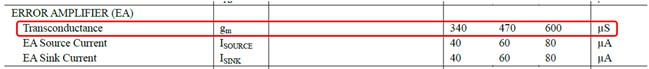 ①エラーアンプ・トランスコンダクタンスのデータシート上の表記箇所