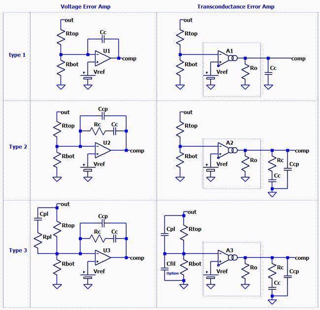 タイプ1は積分器だけです。DCから低速で良い回路には使われますが、DC/DCコンバータではほとんど使われません。タイプ2はゼロとポールを一組追加したもので、電流モードではほぼこれで良いとされていて最も多く使われています。タイプ3は帰還抵抗部にもう一組のゼロとポールを追加したもので、電圧モードで一般的にはこれを使う必要があります。電流モードでもより高速や位相余裕が必要な場合には使われます。